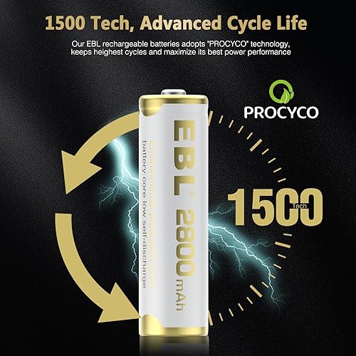 Improved "PROCYCO" Technology: EBL AA rechargeable batteries incorporate the enhanced PROCYCO technology. This upgrade entails a shift from 1200 Tech to 1500 Tech, resulting in improved cycle life and maximizing their power performance to the fullest extent.