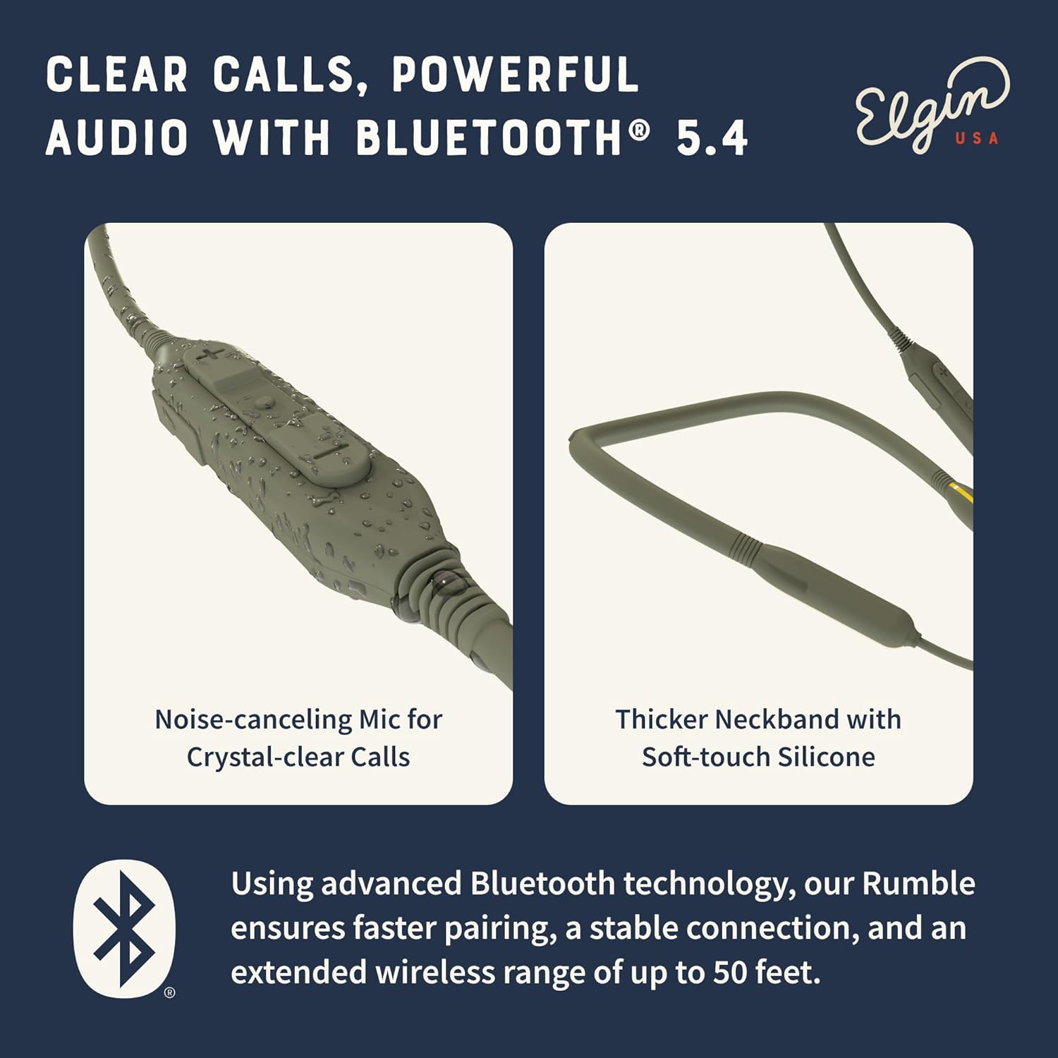 BLUETOOTH 5.1 WIRELESS CONNECTIVITY: Featuring advanced Bluetooth 5.1, the Rumble pairs quickly and maintains a stable connection up to 50 feet; dual custom-tuned drivers provide rich audio, while the noise-canceling microphone ensures clear calls even in noisy settings with heavy equipment running.