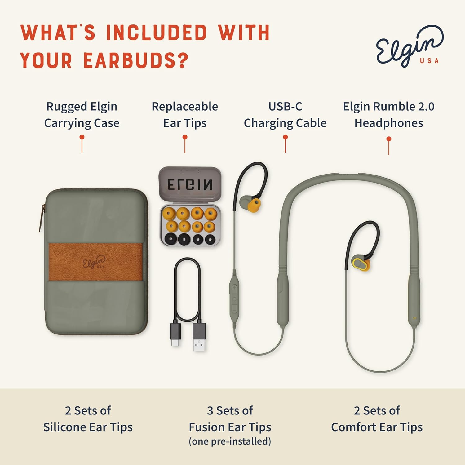 Elgin Rumble Gen 2 Bluetooth Earbuds, 31 dB Noise Reduction with Fusion Tips, IP67 Waterproof Wireless Earplugs, OSHA Compliant ANSI Certified Hearing Protection, 20 Hour Battery, Noise Canceling Mic