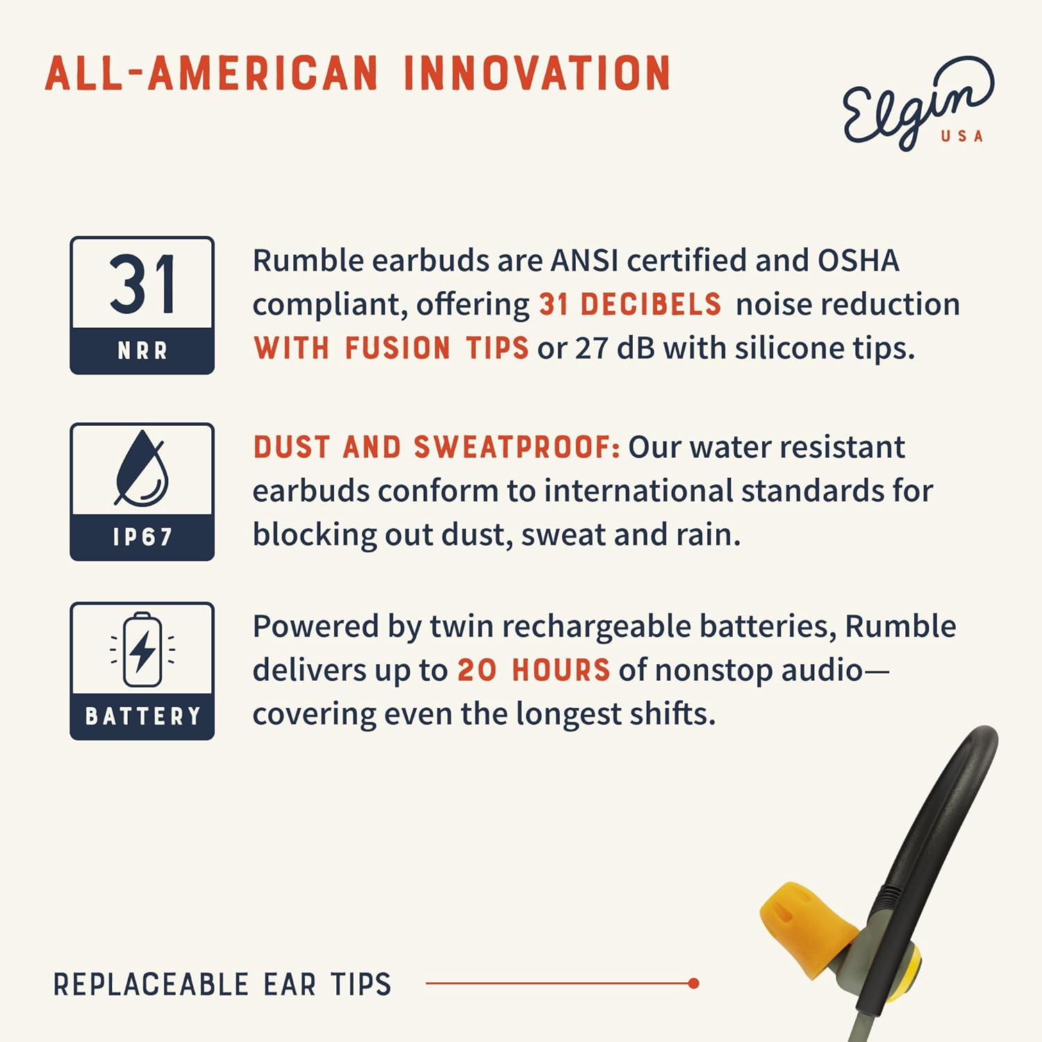 CERTIFIED HEARING PROTECTION 31 DB NRR: Elgin Rumble earbuds are ANSI certified and OSHA compliant, offering 31 dB noise reduction with Fusion tips or 27 dB with silicone tips, delivering reliable hearing protection for construction, landscaping, fabrication, warehouses, and other loud work environments.