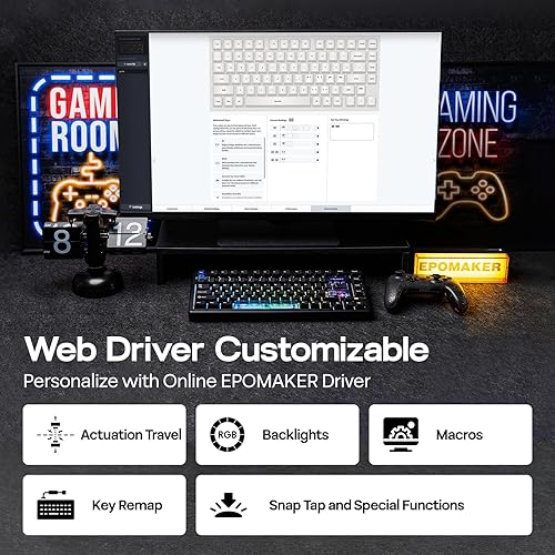 Online EPOMAKER Driver: Customize key functions, actuation travel, macro or backlight across devices, OS system and space, with the chrome-based web software of HE80 that saves you the hassle of download. Experience with SOCD, DKS, MT and RT functions, design personalized backlight effect, tailor keyboard sensitivity or record macro, all are available with real-time visual feedback.