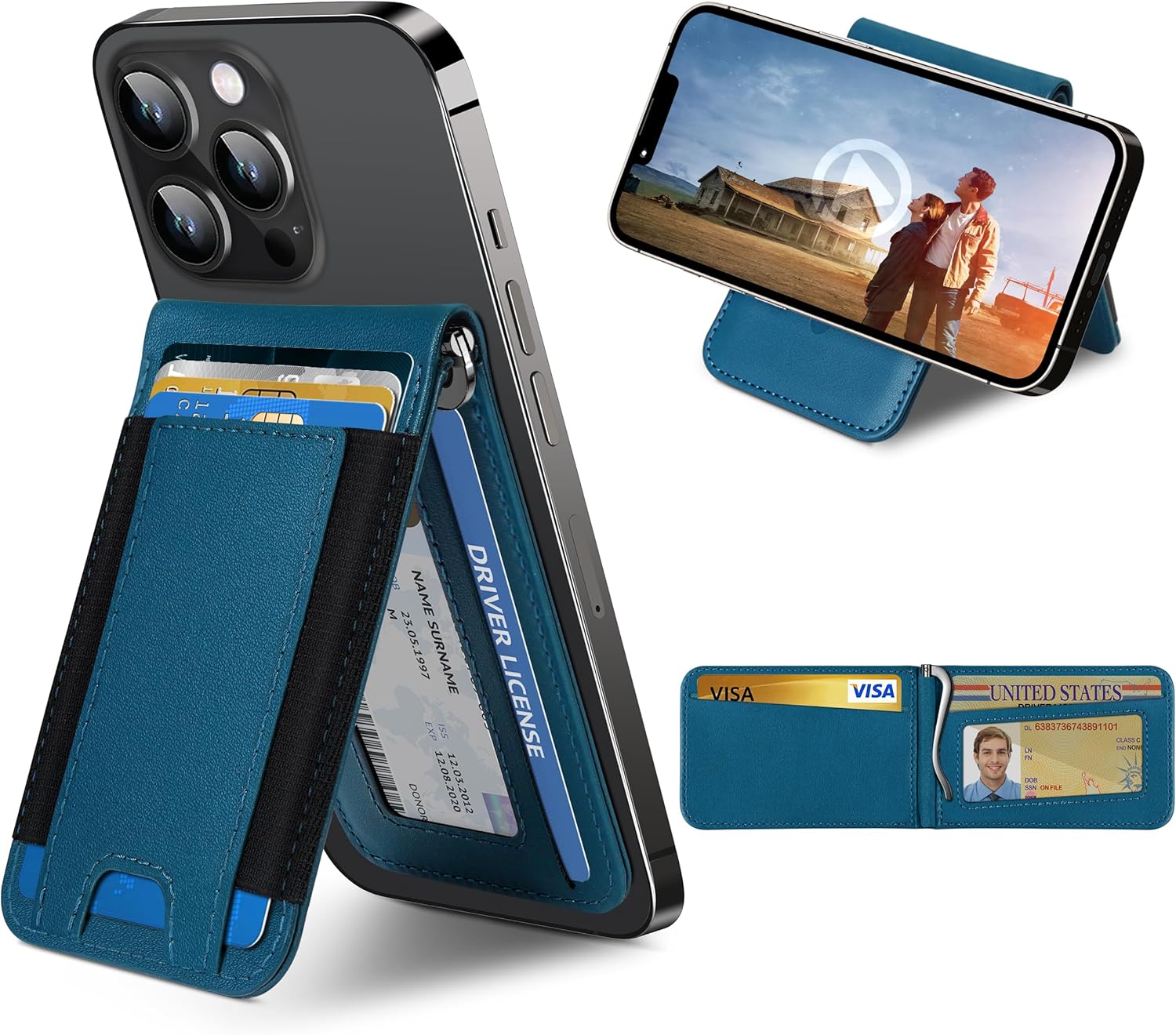 【2-in-1 Magnetic Wallet & Stand】 Upgraded Magsafe wallet designed with money clip, worked for iPhone 17/16/15/14/13/12 series. Works as both a magnetic wallet and a foldable phone stand. Holds up to 8 cards without adding bulk—perfect for quick checkouts or when you want to travel light