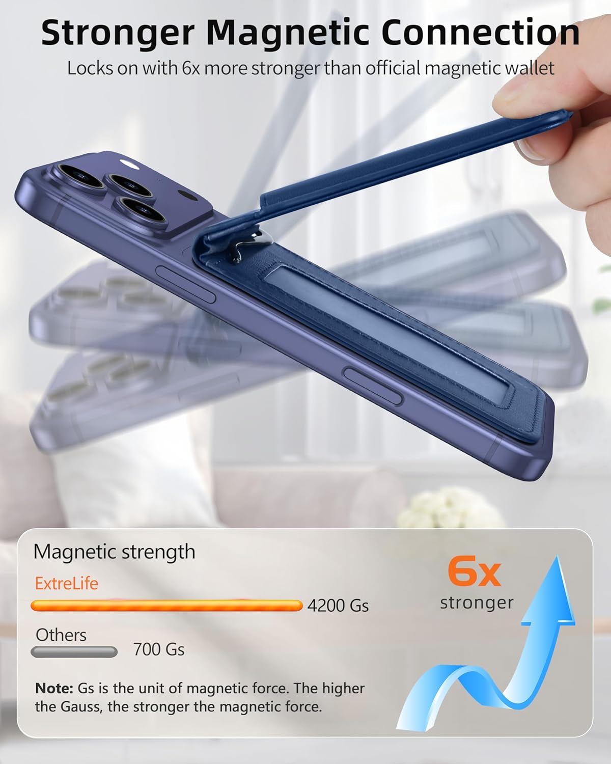 Strongest Magnetic Force: ExtreLife for magsafe wallet upgrade to 4200Gs magnetic force , 6X stronger than official magnetic wallet to ensure your magsafe wallet stand stay securely on the back of your iPhone. Never worrying about the cards and cash falling off.