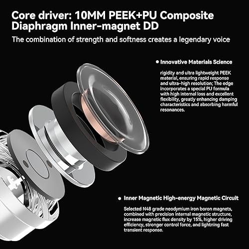 10MM PEEK+PU Composite Diaphragm Inner-magnet DD:The central area of the diaphragm is made of high rigidity and ultra lightweight PEEK material, ensuring rapid response and ultra-high resolution; The edge incorporates a special PU formula with high internal loss and excellent flexibility, greatly enhancing damping characteristics and absorbing harmful resonances