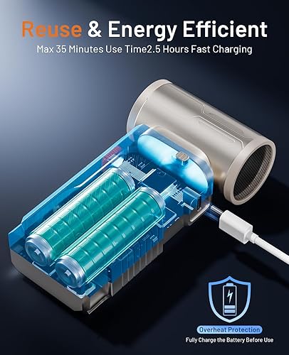 2.5 Hours Fast Charging: Cimesen F91 compressed air duster fully recharges in just 2.5 hours with a type-C cable, which can run continuously for 15-35 minutes on the lowest setting to highest setting