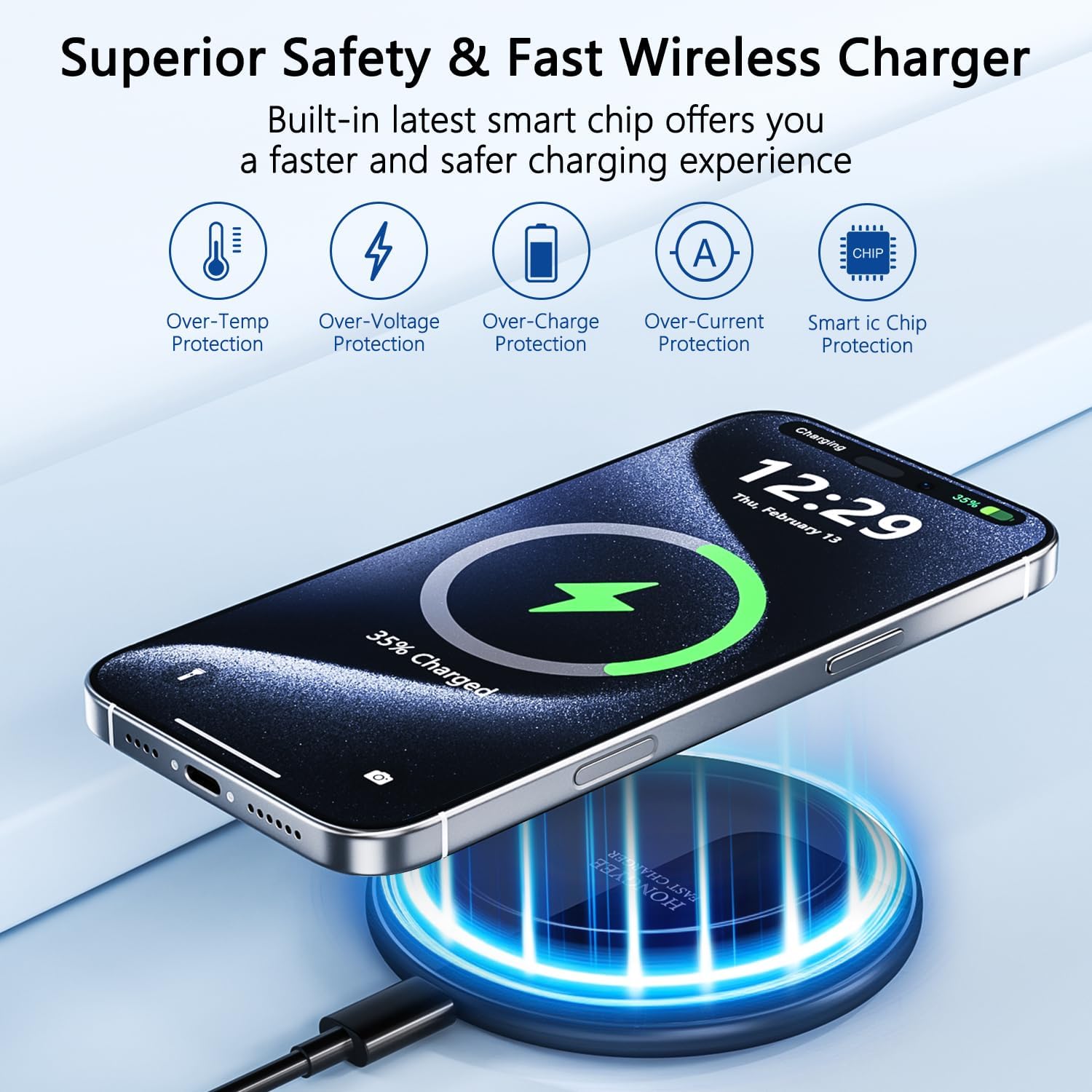【Sleep-Friendly LED Indicator and Safe to Use】The wireless charger will light up blue for 60 seconds and then turn off during charging, quietly uses LED lights to display charge status, allowing undisturbed sleep with no notification sounds.With built-in protections against over-voltage, over-temperature, over-current, short-circuit, and other potential hazards, it keeps your device's battery safe from overcharge damage.