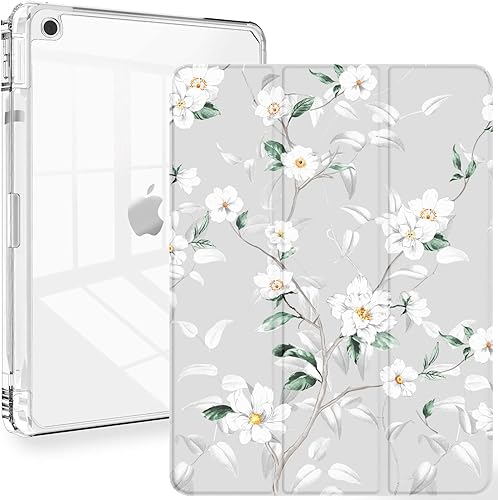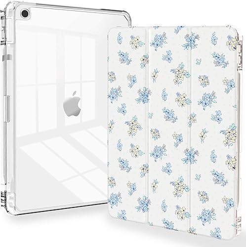 Feams for iPad 9th Generation Case, Trifold iPad 10.2 Case Clear Back Cover with Pencil Holder & Auto Sleep/Wake for iPad 9th/8th/7th Generation 2021/2020/2019, Blue Blossom(Simple Flowers)
