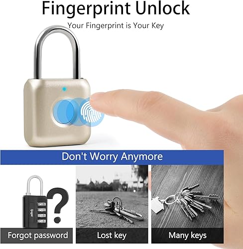 Fingerprint Padlock, Keyless Biometric Lock, Water-Resistant, USB Rechargeable Smart Lock for Bookcases, Bikes, Sports Lockers, Storage, Blue(Gold)