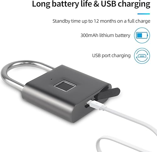 【Low Power Alarm】It takes only 1~2 hours to charge this fingerprint padlock, and it can perform 10,000 unlocking operations after fully charged, with a normal standby time of up to 12 months. When the voltage is ≤3.5V, the red light will flash 3 times after unlocking to remind users to charge in time.