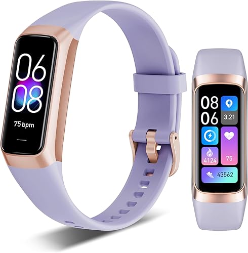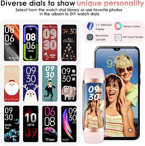 1.1" AMOLED HD Color Touchscreen: Activity and fitness trackers features a stunning 1.1" AMOLED display (126x294) with vibrant colors, paired with a ABS frosted curved frame and skin-friendly TPU straps for a stylish look; there are multiple dial styles to choose from in the APP, or use your favorite photos in the album to match your style, personalize your device according to your preferences, mood or clothing; watch dial display module is intuitive and clear, easy to read