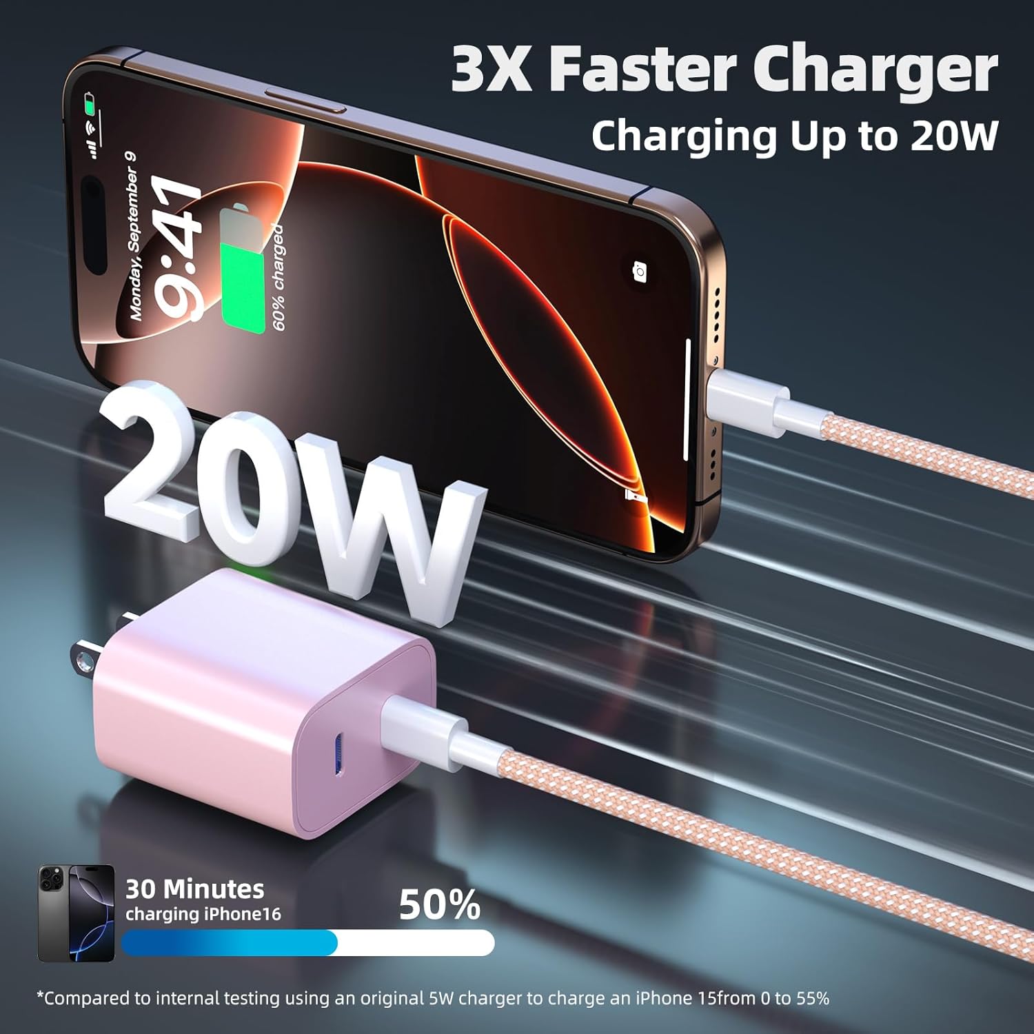 【Fast Charger Charger for iPhone 17 16 15 Pro Max】PD 20W USBC charger power delivery wall plug with 6ft type c to c charging cord. USB-C port provides Max 20W output power, 3X faster than standard USB charger.charging for iPhone 17 16 15 up to 50% in just 30 minutes, which saves more than 1 hour for you, when compared to the 5W original charger.