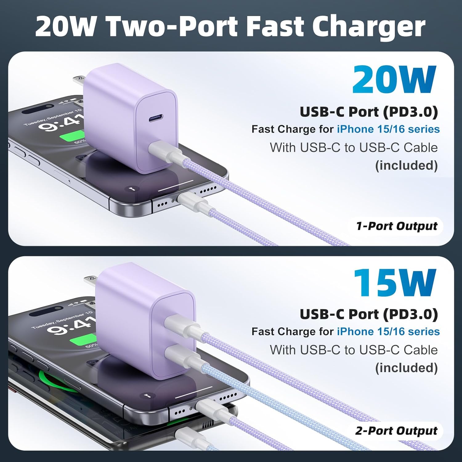 【What You Get】4 x 20W Dual Ports USB C iPhone 17 16 15 Fast Charger Block and 4 Pack of 6 foot usb-c to C cable are packed in a bag, which can satisfy the needs of multiple devices in different places like iPhone/ipad,and also for family or friends to use, Contains 4 different colors to make your life colorful. If you have any questions, please feel free to contact us.