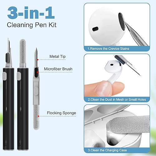【3 in 1 Cleaner】This product includes a cleaning pen designed for headphone charging cases. Equipped with a soft microfiber brush, metal tip and flocked sponge, it effectively removes dust and debris from the charging case and the crevices of the charging port.