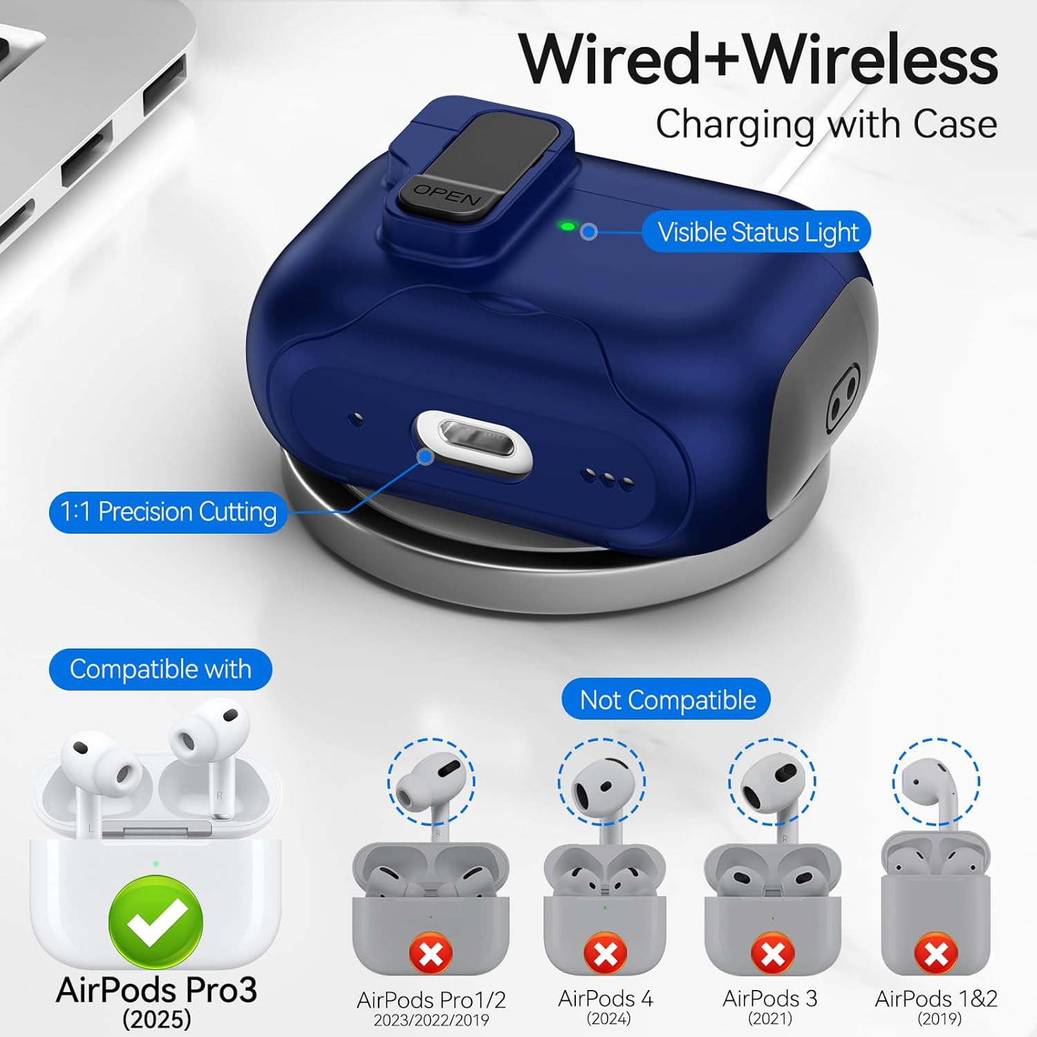 【Front LED Visible & Precise Cutout】 The visible front LED light design allows you to identify whether your Airpods is charging without removing the protective case. The bottom of case has a precisely cut charging portm,Wirelss charging support.Needn't remove case when charing.