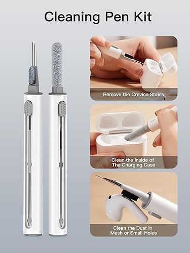 【3 in 1 Cleaning Pen】:The cleaning pen with metal pen tip, soft brush and the high-density flocking brush can help you remove dust and dirt from your Bluetooth headphones, always keeping them as new.