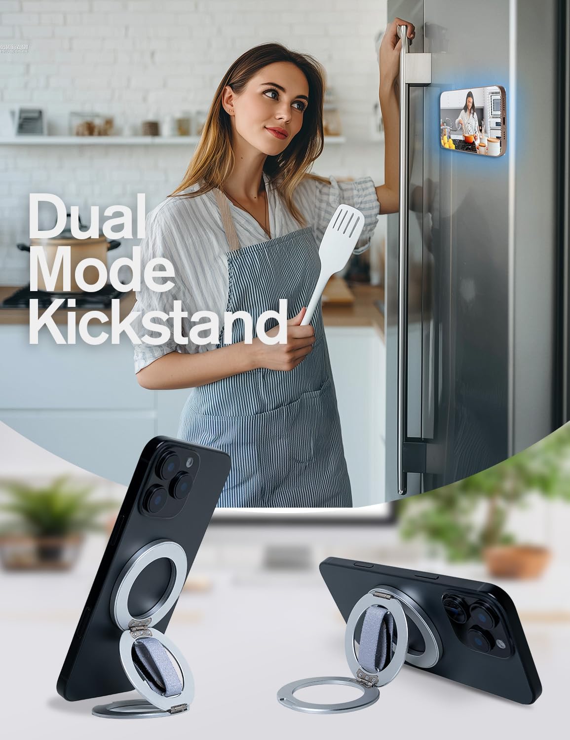 【Double-Sided Magnetic Kickstand】Features a unique two-sided magnetic design, so it works with MagSafe car mounts without needing to remove the ring.It can also be attached to any magnetic metal surface, including fitness equipment, fridges, cabinets, and iron railings, making it ideal for hands-free use in the kitchen, office, gym, and more.
