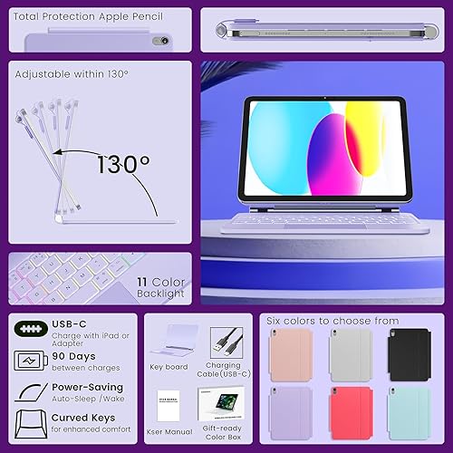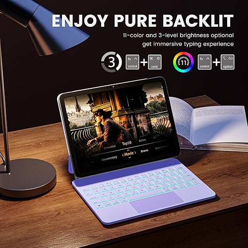 Backlight andshortcut key:11-color backlight keyboard with shortcuts - fluidly and accurately typing on the lighted keyboard for iPad 10th generation even in a dark room, ergonomic keys, 11 colors of backlight, and three adjustable backlight brightness levels give you a comfortable typing experience. No more searching around for basic functions, be more efficient with a full row of PadOS shortcuts to adjust brightness levels, change backlit colors, media, volume control, and more.