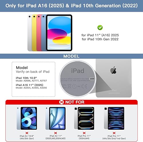 Compatibility: Only compatible with iPad 11th Gen (A16,2025) models: A3354/A3355/A3356, and iPad 10th Gen 10.9" models: A2696/A2757/A2777. (Note: This product is NOT suitable for iPad Pro 11 inch & iPad Air 11-inch. Please verify your tablet model before purchase.)