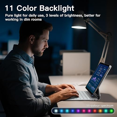 Backlight andshortcut key:11-color backlight keyboard with shortcuts - fluidly and accurately typing on the lighted keyboard for iPad Pro 11 even in a dark room, ergonomic keys, 11 colors of backlight, and three adjustable backlight brightness levels give you a comfortable typing experience. No more searching around for basic functions, be more efficient with a full row of PadOS shortcuts to adjust brightness levels, change backlit colors, media, volume control, and more.