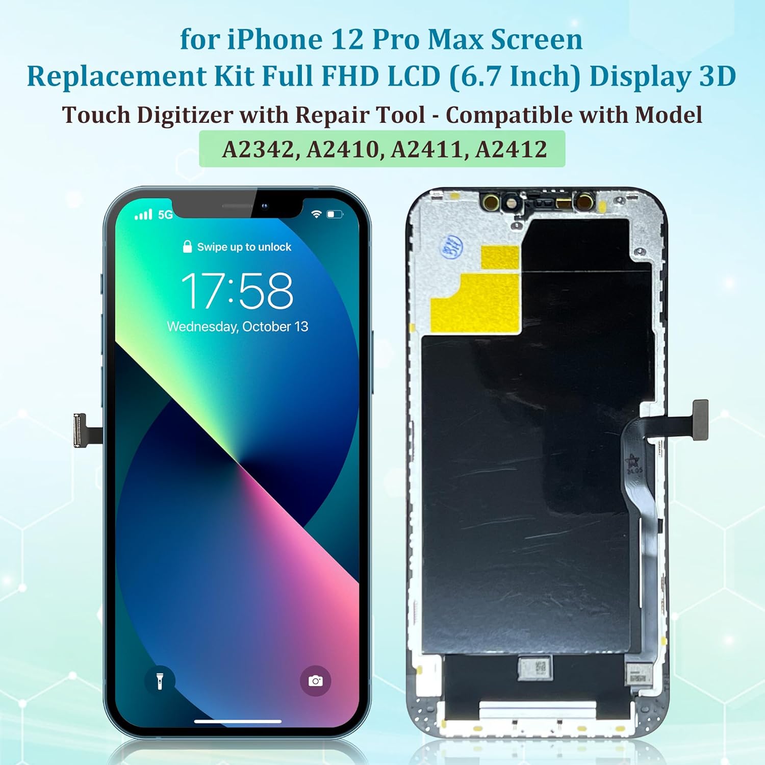 for iPhone 12 Mini Screen Replacement Kit Full FHD (5.4 Inch) LCD Display 3D Touch Digitizer with Repair Tool - Compatible with Model A2176/A2398/A2400/A2399 - Black(For iPhone 12 Pro Max-6.7")