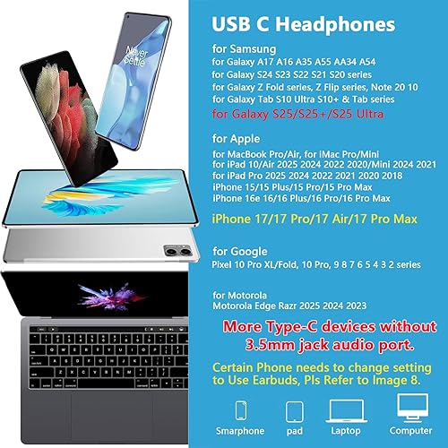 USB C Headphones Wired Wide Compatibility: This usb c wired headphone is compatible with all USB C devices without 3.5mm jack audio port. iPhone 17/17 Pro/17 Pro Max iPhone Air, 16e 16/16 Pro/16 Pro Max/16 Plus,15/15 Pro/15 Pro Max/15 Plus; Samsung Galaxy A17 A16 5G A16 A36 A26 A56 A35 A55 A54 A34 S25 FE Edge S25 Ultra S25+ S25 S24 S23 S22 S21 S20 series,Z Fold 7 6 5 4 3,Z Flip 7 FE Flip7 6 5 4;Google Pixel 10 Pro XL/10 Pro/10 Pro Fold/10, LG and more type c devices without 3.5mm jack port.