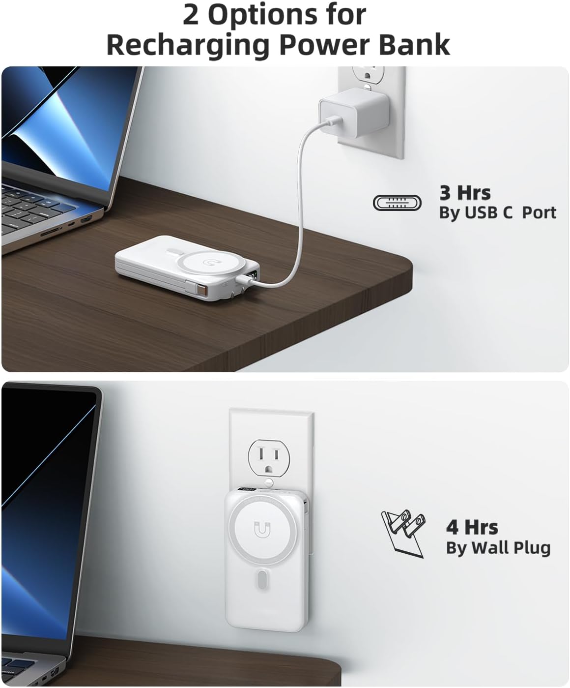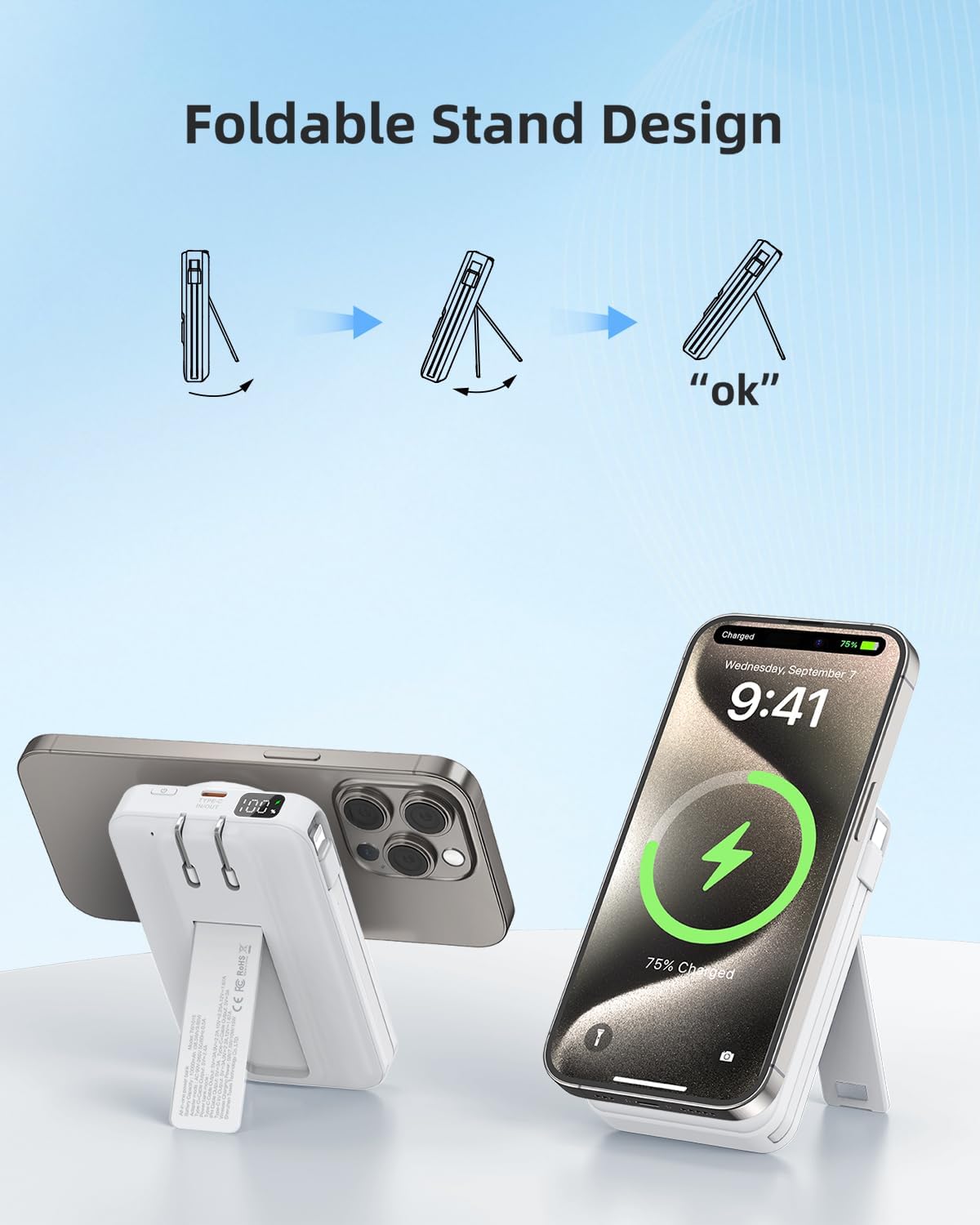 Foldable Stand for Hands-Free Use: Equipped with a sturdy foldable stand, this portable wireless charger for MagSafe iPhone easily transforms your device into a mini workstation or entertainment screen while charging. Use it vertically for FaceTime or horizontally for Netflix. More than just a power bank, it’s a practical portable charger that adds convenience to work, travel, or daily use