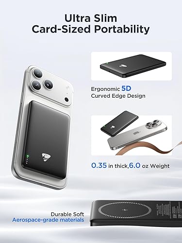 【Ultra-Slim Engineering, Big Power Inside】 At only 0.35 inches thin, this magsafe power bank is slimmer than iphone 15, yet it houses a high-density 5,000mAh battery core. Its slim profile means you can slide it effortlessly into your pocket, backpack, or laptop sleeve, making it the ultimate balance between cutting-edge design and practical performance.Made of skin-friendly aluminum, it feels comfortable and premium