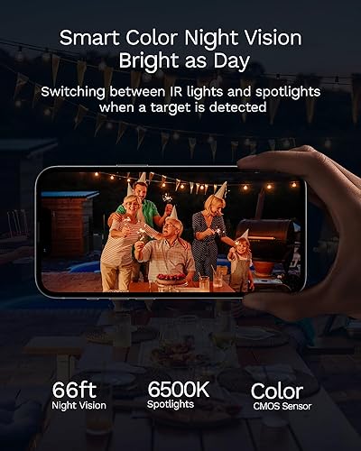 【Smart 360° Full-Color Night Vision: See Everything Clearly】Monitor every angle with 360° full-color night vision on this night vision security camera. A 4mm lens, F1.6 aperture, 8 IR LEDs and CMOS sensor ensure sharp, vibrant images, even in total darkness. With 355° horizontal and 90° vertical rotation, the PD5 eliminates blind spots. The 6500K spotlight provides bright illumination, and with manual/automatic color night vision, you’ll see everything as if it were daylight, even at 66ft.