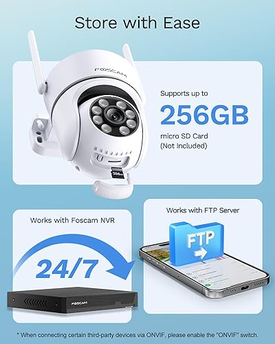 【Secure Cloud & Card Storage with IP65 Weatherproof】Store your footage safely with 256GB microSD card, FTP, NVR or Foscam cloud storage, featuring industry-leading privacy protection. PD5 ensures your data stays secure while giving you easy access to recordings, as well as supports Onvif protocol with the "Onvif" switch enabled. Built to last, this IP65 waterproof security camera withstands rain, snow, and extreme temperatures. Whether monitoring your home, office, or driveway, trust this outdoor camera wireless to keep your property safe in any weather.