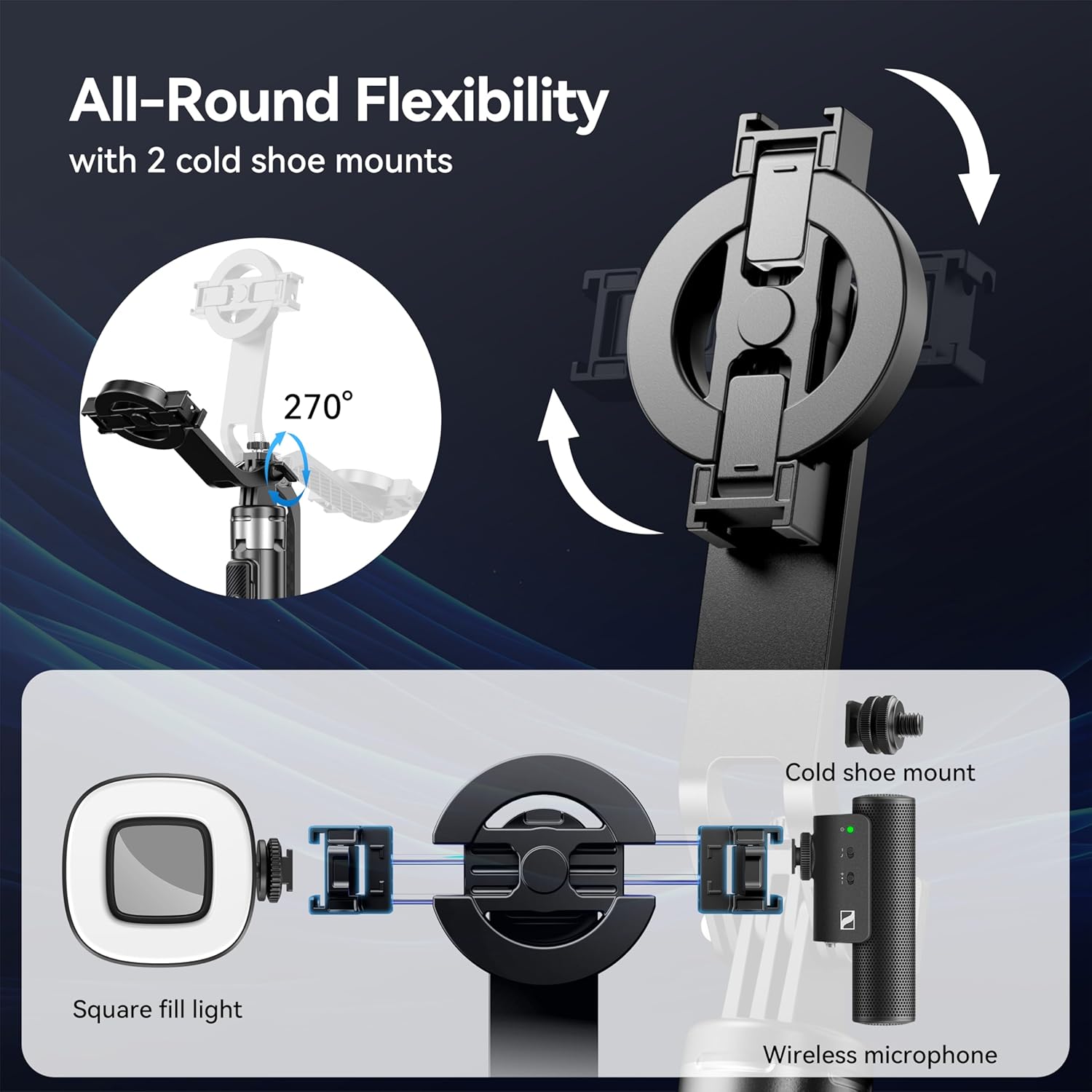 Extendable Phone Selfie Stick Tripod: Telescoping from 8.7″ to 53″, this extendable cell phone tripod provides 3-axis flexibility, a 270° tilt neck, and 180°/360° rotation for perfect shots at any angle.