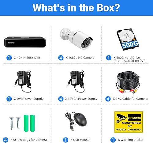 Fuers Wired Security Camera System with Human Detection, H.265+ 3K Lite 4 Channel DVR and 4 x 1080P 2MP CCTV IP66 Cameras with Night Vision for Outdoor Use, 500G Hard Drive,Remote Access(4CH-2MP-4-A606Cam-500HDD)