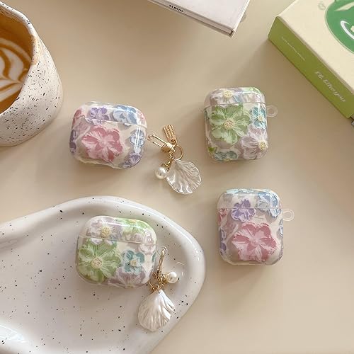 Fycyko Compatible for AirPods 2 &1 Case Soft TPU with Cleaner Kit Cute Colorful Retro Oil Painting Printed Flower Design Shockproof Pearl Keychain Cover for Girls Woman- Pink(Mint Green,for AirPods 2)
