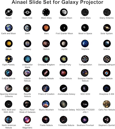 PACKING LIST & WARRANTY: Ainael Galaxy Projector Disc Set includes 6 stunning slides featuring: Saturn, Black Hole, Moon Story, Gibbous Moon, Arctic Stars, and Starry Antarctic. We stand behind the quality of our product — enjoy peace of mind with our one-year replacement guarantee in case of any issues. If you have questions or need assistance, our friendly support team is always here to help. (Note: Projector not included.)