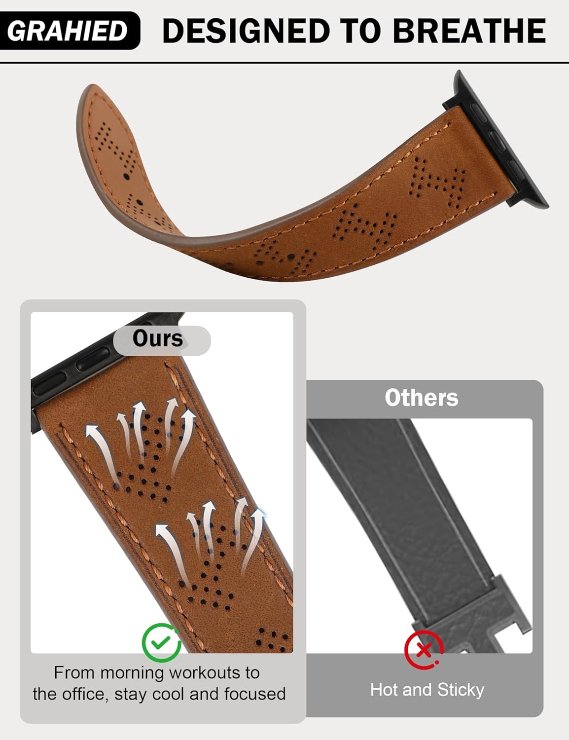 Premium Leather with Airflow – Your Wrist’s Business Partner: Think of this classic watch band as your wrist’s personal assistant: made from top-grain leather with honeycomb ventilation, it keeps you cool through daily office hours, business meetings, or even outdoor adventures. Elegance and comfort—always by your side