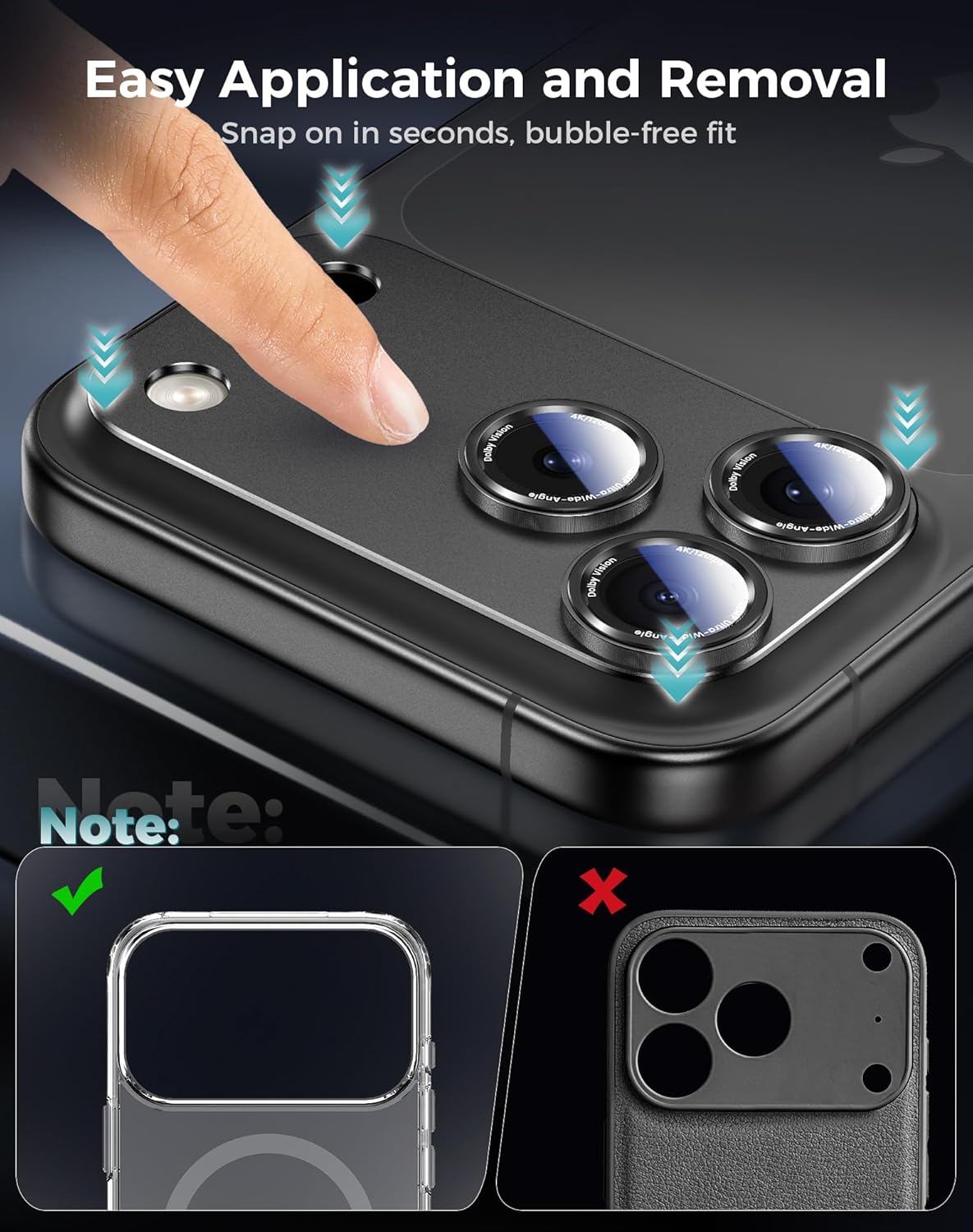 Easy Install : Snap-on adhesive design for tool-free installation in seconds. this metal camera lens protector compatible for iPhone 17 promax 2025, Please check the phone model, and make sure you order the correct size