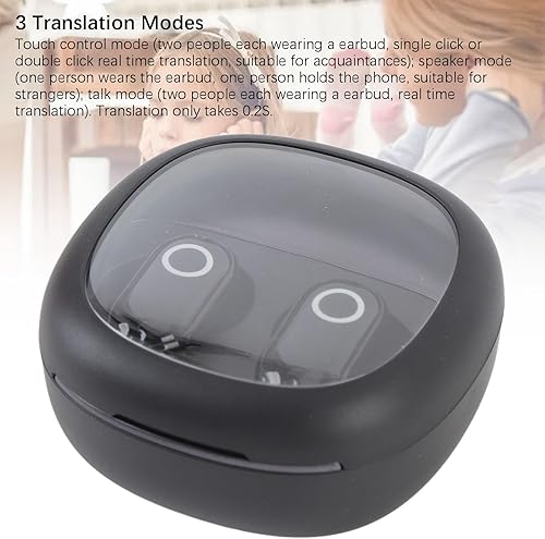 3 Translation Modes: Touch control mode (two people each wearing a earbud, single click or double click real time translation, suitable for acquaintances); speaker mode (one person wears the earbud, one person holds the phone, suitable for strangers); talk mode (two people each wearing a earbud, real time translation). Translation only takes 0.2S.