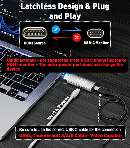 【Working Principle】Be sure to use the USB4, Thunderbolt 3/4/5 cable for connecting the adapter to the monitor. This HDMI to USB C adapter only supports transfer from HDMI source device to USB-C display device. Please plug the HDMI male connector into a source device equipped with HDMI port, such as laptop, PS5, Xbox, TV box, etc., and connect the USB-C female connector to the monitor, Xreak Air, Nreal Air, Rokid, etc., display device using a usb c cable with specification of USB4, Thunderbolt version 3/4/5