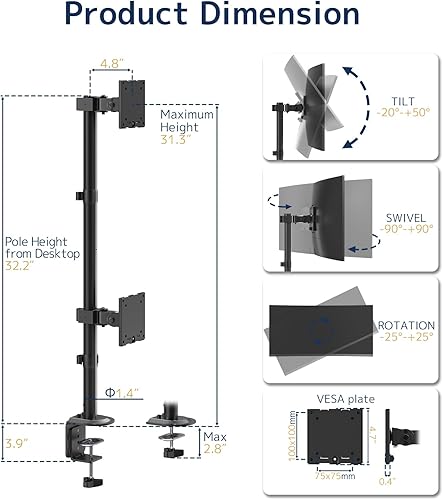 Extended Adjustable Pole: 32.2" reinforced center column provides ample vertical spacing for dual-screen positioning, supporting smooth height adjustment and ±90° swivel, +50°/-20° tilt, and ±25° rotation per screen