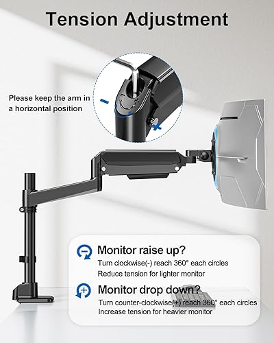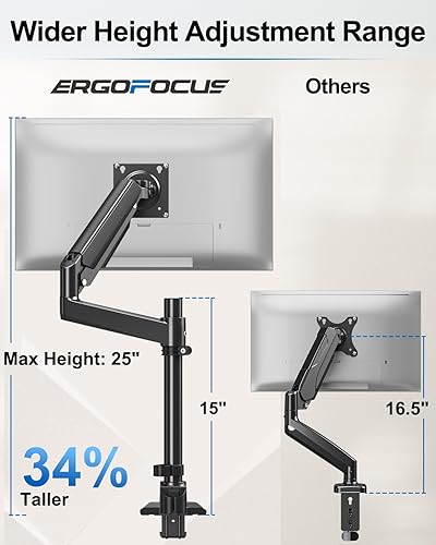 Column Design for Extended Height Range:Outperforms traditional desk clamps with a column structure, ErgoFocus single monitor arm offering wider vertical adjustment to accommodate various heights and use cases. Easily achieve the perfect viewing angle.