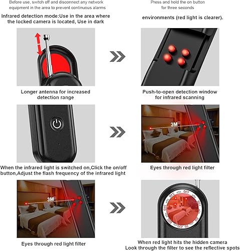 Simple Operation:The hidden camera detector boasts rich functionality yet remains user-friendly. Simply press the "mode" and "detection key" buttons to switch between functions effortlessly. Then, a simple left and right movement scans the surroundings. It's easy to operate, even for beginners