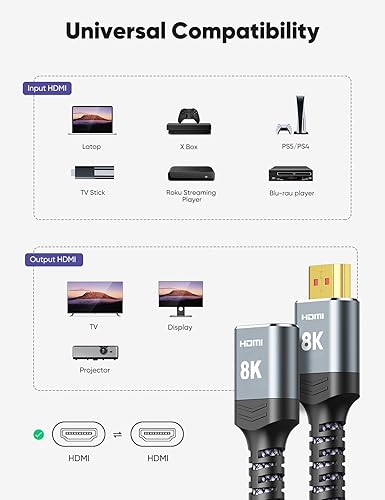 SUPPORTS 8K VIDEO and MORE: This HDMI extender cable supports HDMI Ethernet Channel, 8K@60Hz, 4K@120Hz, 2K, 1080P, 48Gbps bandwidth, 48-bit HDR color depth, and Audio Return Channel (ARC); Full 3D Support without any lag, providing clear and smooth video