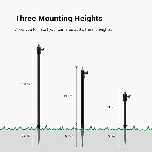 ADJUSTABLE HEIGHT & ANGLE: Includes one 6.1" ground stake and three 6.2" stackable rods to reach 9", 15", or 21" in height. The 360° swivel and 180° tilt mount head give you maximum flexibility for the best viewing angle