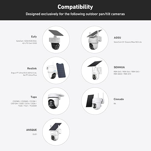 WIDE PTZ CAMERA COMPATIBILITY: Perfectly fits popular PTZ cameras including Eufy Solocam S340/E30/E42, Eufy 4G LTE Cam S330, Reolink Argus PT Ultra/(5/2.4GHz)/Lite, Reolink Go PT Ultra/Plus, AOSU SolarCam D1 Classic/Max/SE/Lite, Tapo C530WS C520WS/C510W/C500/C501W/TC40GW/C51A/C52A, ANSQUE GU01, SEHMUA RBX-S73/RBX-S45/RBX-S40/RBX-S44/RBX-SD22 and Cinnado B6.