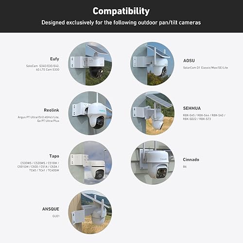 WIDE COMPATIBILITY: Designed for popular PTZ security cameras like Eufy SoloCam S340/E30/E42, Eufy 4G LTE Cam S330, AOSU SolarCam D1 Classic/Max/SE/Lite, Reolink Argus PT Ultra/(5/2.4GHz)/Lite, Reolink Go PT Ultra/Plus, Tapo C530WS/C520WS/C510W/C500/C501W/C51A/C52A/TC40GW/TC40/TC41, Cinnado B6, ANSQUE GU01/SA01, and SEHMUA RBX-S73/RBX-S45/RBX-S44/RBX-S40/RBX-SD22 outdoor pan and tilt security cameras, ensuring a secure fit for enhanced surveillance.