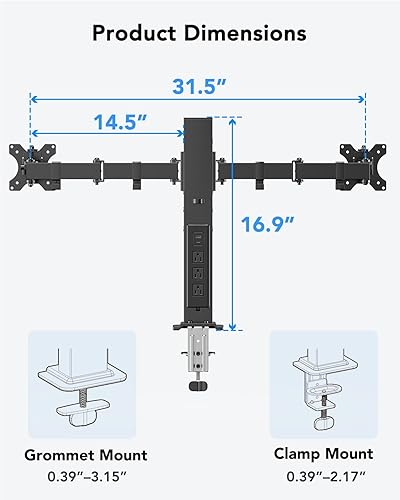 Exceptional Stability: The dual monitor mount with power outlet features a 1.57″ x 2.76″ rectangular post, which is thicker and sturdier than most other mounts on the market. The dual monitor arms support up to 22 lbs each, and has gone through extensive testing, proving this double monitor stand keeps your monitors steady without drooping.