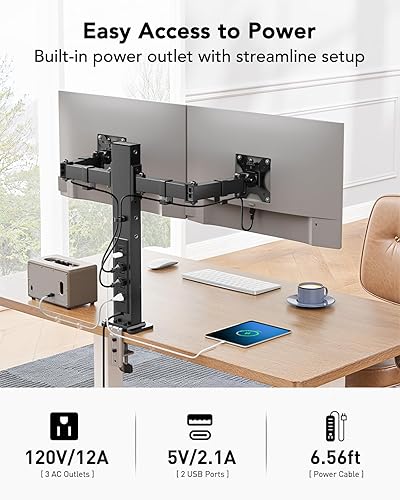 Integrated Power, Reduced Clutter: This dual monitor stand with power outlet includes an integrated power outlet with one USB-A port, one USB-C port, and three AC outlets, plus a 6.5 ft power cord. No need for extra power sockets, reducing desktop clutter and enhancing efficiency at work. Easily charge your devices while optimizing your workspace.