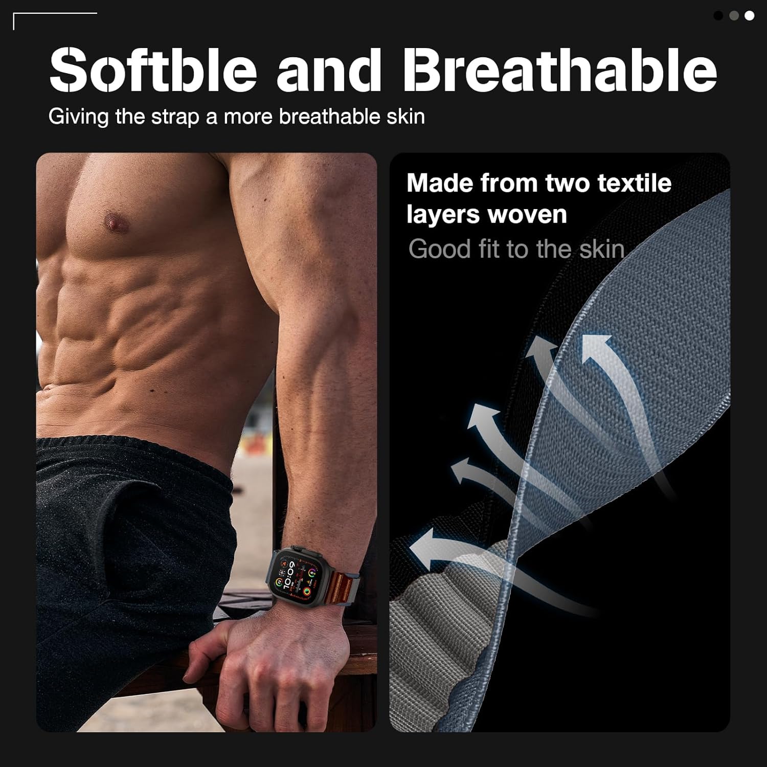 [ Material & Design: Stylish Combination for Every Occasion ] This band compatible with Apple Watch Bands Ultra 3 2, Ultra, Series 11 10 9 8 7 6 5 4 SE 3 2 SE combines high-strength nylon with vintage-inspired leather. Robust nylon main body with decorative leather elements – perfect balance between stability and flexibility. Precision stitching for smooth haptics & durability. Simple, universal design: Ideal for business, sports & leisure.