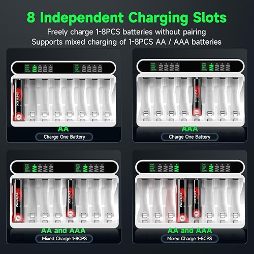 【8Bay Independent Charging Slots】- The AA AAA battery charger can charge one battery alone or up to 8 identical batteries without charging them in pairs. It can also be used in combination, such as 5 AA batteries and 3 AAA battery. A great charger for AA / AAA rechargeable batteries