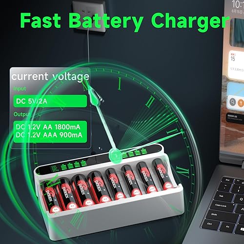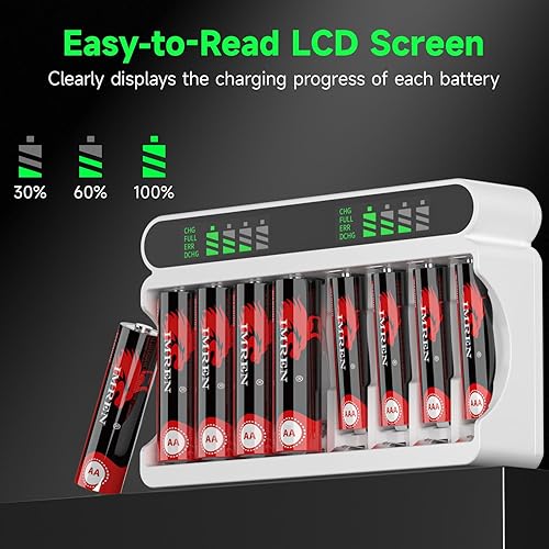 【Easy-to-Read Charge Status LCD Screen】- The AA AAA battery charger clearly display the charging progress of each battery to help you keep track of the charging level. The green display has 3 lines indicating 30 % / 60 % / 100 % charged. Easy understand and easy to see