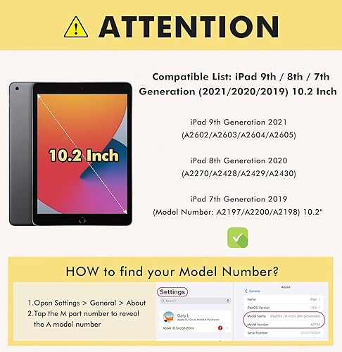Exclusive Design: Only fit Apple iPad 10.2 inch 2021/2020/2019, 9th/8th/7th Generation, DO NOT compatible with other iPad models. NOTE: Please confirm the model number "AXXX" in small print on the back bottom of your iPad